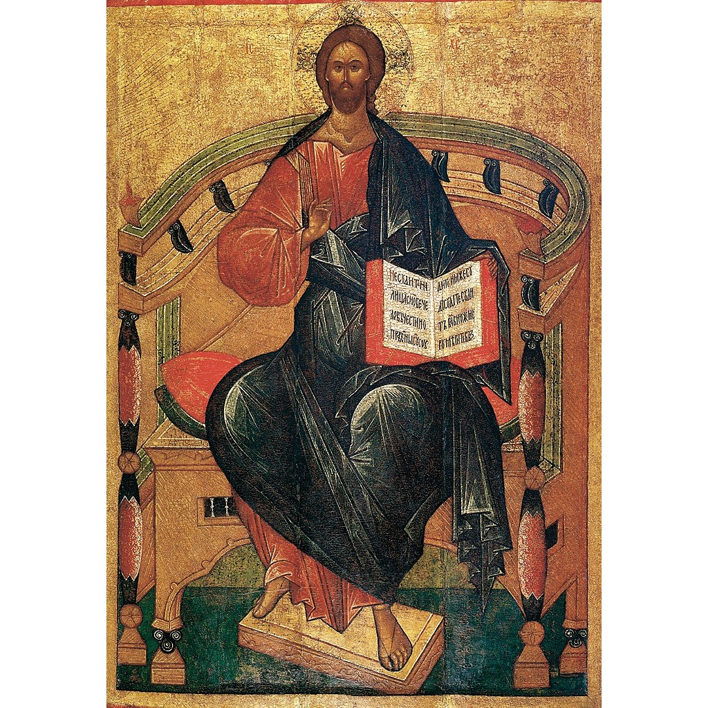 Изображение Иисуса Христа в полный рост, восседающим на троне, выполнено соответственно канону. Спаситель поднимает правую руку в благословляющем жесте, в левой - держит раскрытое Евангелие.