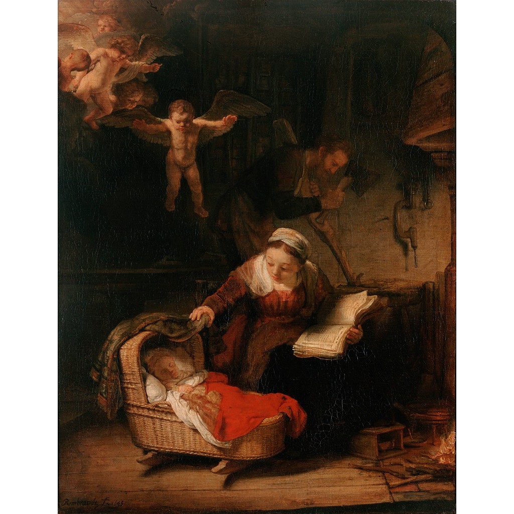 Эта проникнутая удивительной нежностью картина подтверждает дар Рембрандта до такой степени смешивать божественное и земное, что уже невозможно провести грань между ними. Богоматерь прервала чтение, чтобы поправить покрывало на Младенце, а может, чтобы прикрыть Его лицо от яркого света, призванного подчеркнуть Его величие. Преисполненная нежности Мария склонилась над Иисусом, с истинно материнской заботой лишний раз проверяя, все ли в порядке с ребенком. Младенец спит крепким сном в плетеной колыбели, не сознавая, что происходит вокруг. На заднем плане плотничает муж Марии Иосиф. Мать, дитя, даже колыбель - чисто голландские типы XVII века. Это могла бы быть, пожалуй, любая обычная семья, если бы не слетающие с небес ангелы-дети.